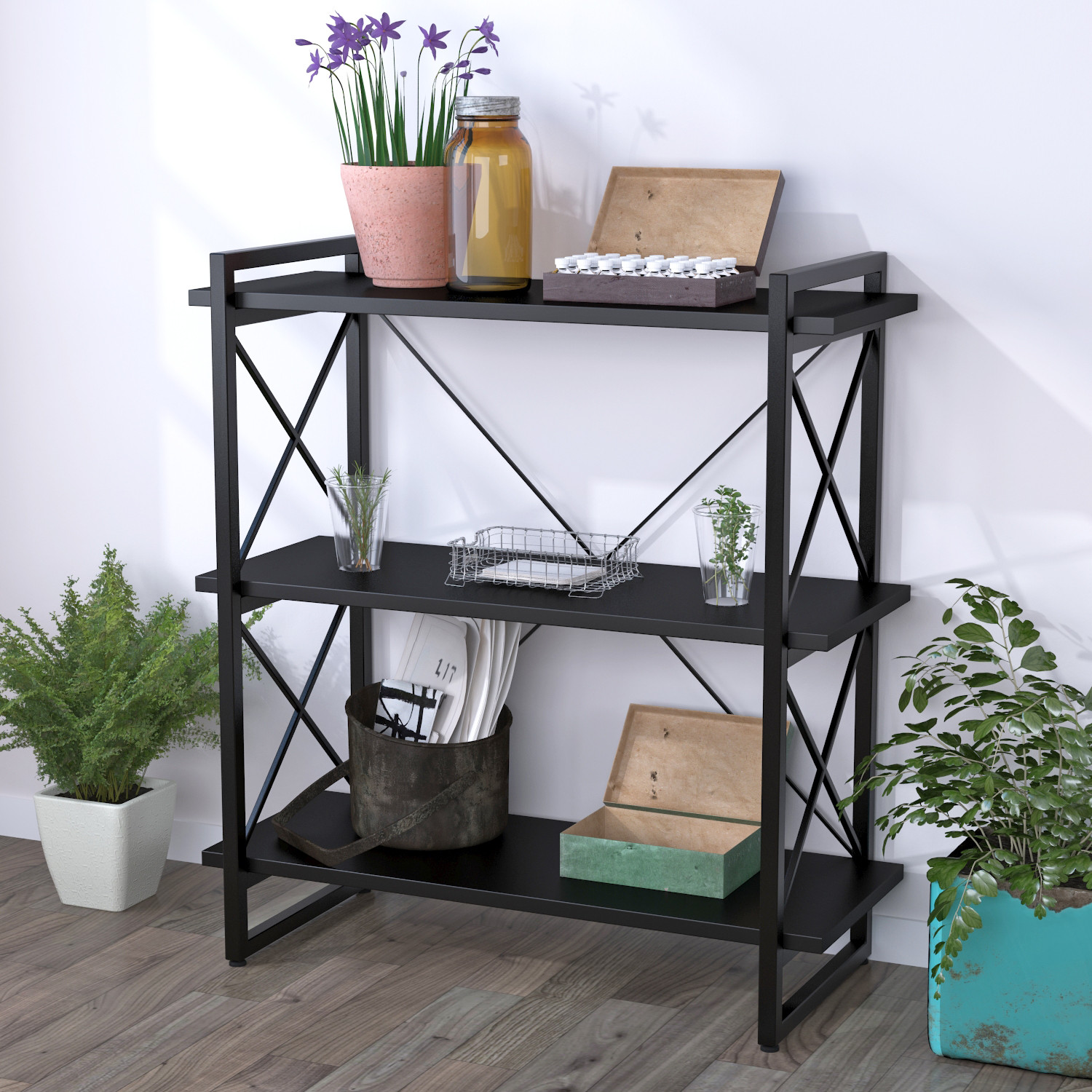 Металеві опори мають декоративні хрестоподібні вставки, на які можна спирати книги чи каталоги. Міцний каркас є надійною опорою для полиць.