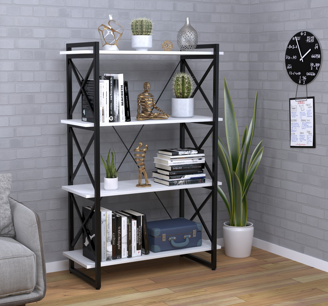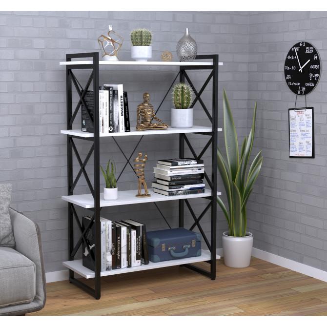 Металеві опори стелажу мають декоративні хрестоподібні вставки, на які можна спирати предмети. Міцний каркас є надійної опорою для полиць. Він проглядається з усіх сторін, акцентуючи увагу на предметах, що лежать на полицях. А акуратне виконання деталей стелажа і геометрична гармонія конструкції підкреслює тонкий смак власника приміщення.