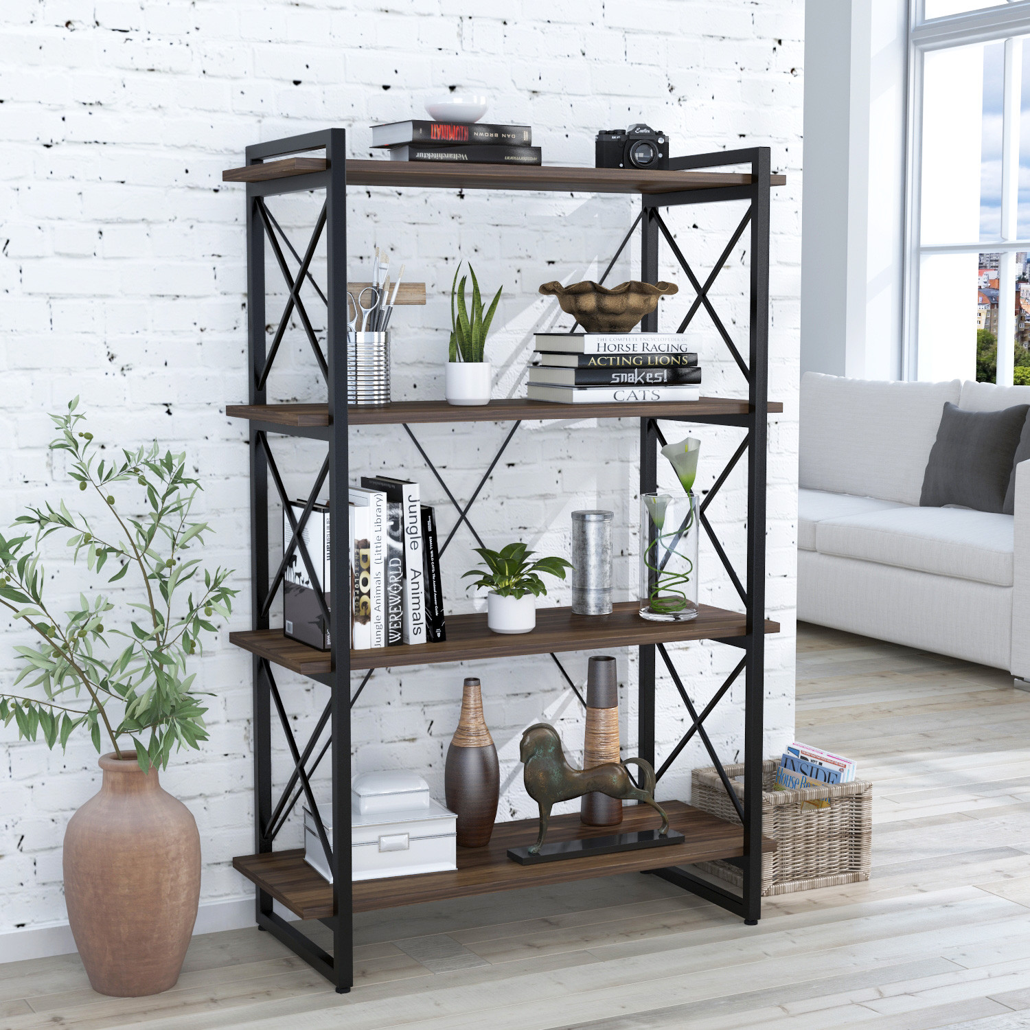 Металеві опори стелажу мають декоративні хрестоподібні вставки, на які можна спирати предмети. Міцний каркас є надійної опорою для полиць. Він проглядається з усіх сторін, акцентуючи увагу на предметах, що лежать на полицях. А акуратне виконання деталей стелажа і геометрична гармонія конструкції підкреслює тонкий смак власника приміщення.