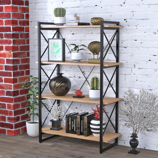 Металеві опори стелажу мають декоративні хрестоподібні вставки, на які можна спирати предмети. Міцний каркас є надійної опорою для полиць. Він проглядається з усіх сторін, акцентуючи увагу на предметах, що лежать на полицях. А акуратне виконання деталей стелажа і геометрична гармонія конструкції підкреслює тонкий смак власника приміщення.