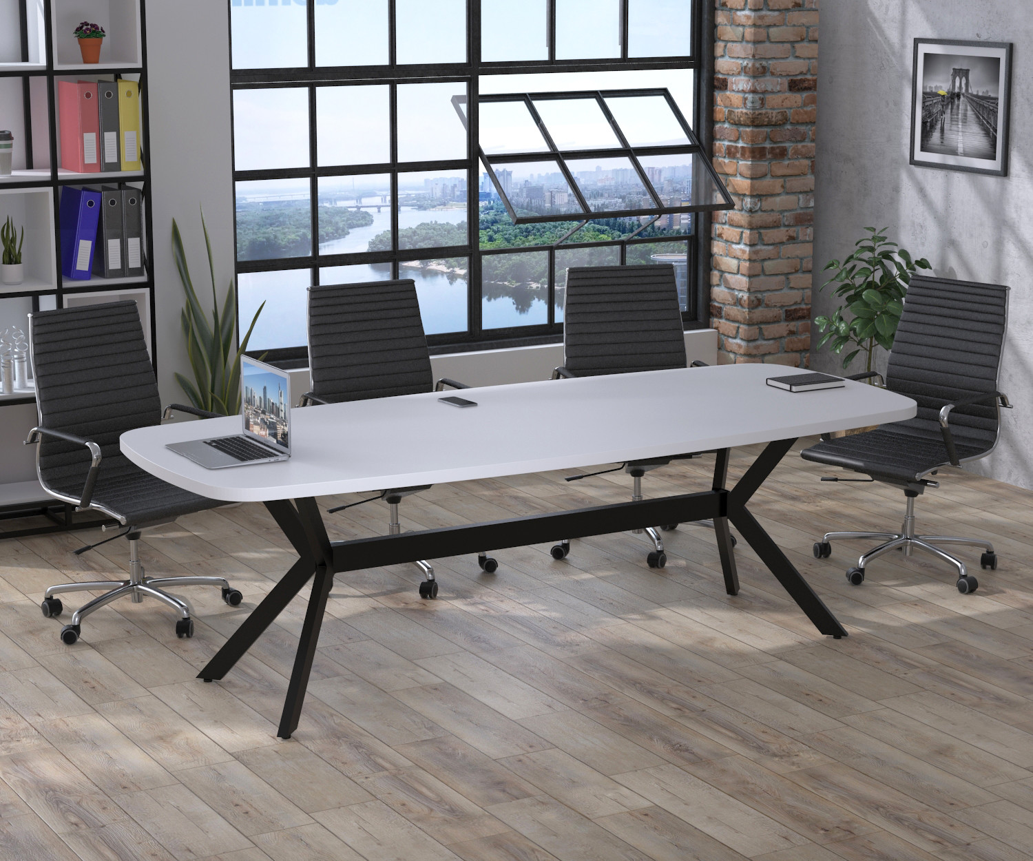 Завдяки заокругленим краям стіл виглядає елегантно та безпечно, створює більш м’яку й сприятливу атмосферу для спілкування. Конструкція столу включає міцні металеві опори, з’єднані нижньою перегородкою з ДСП, масивну стільницю та можливість встановлення вбудованих розеток.