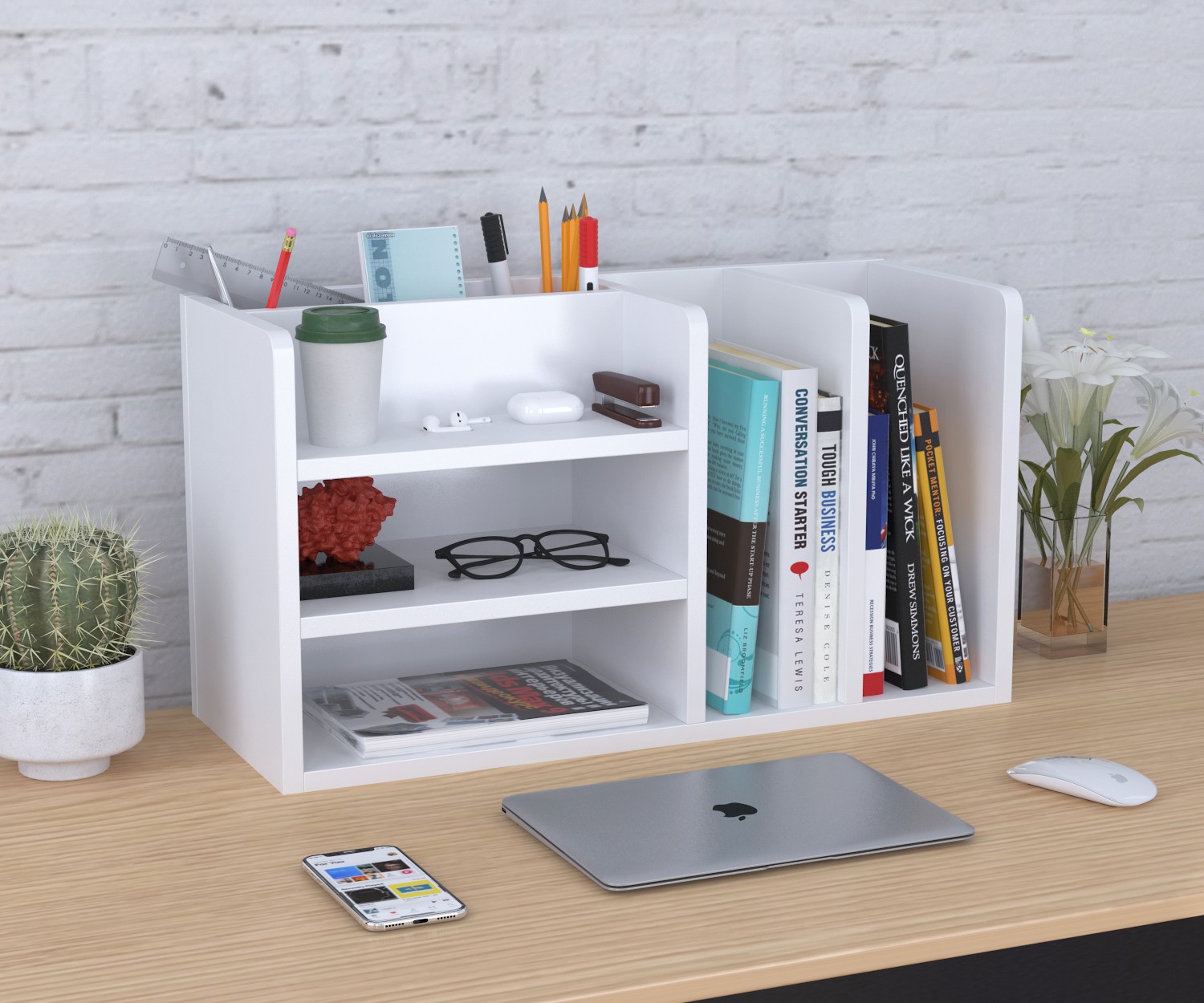 На верхніх ярусах можна розташувати елементи декору, горщик для квітів або пенал для канцелярії. Саму надставку можна поставити у вільний кут столу, де вона не заважатиме.