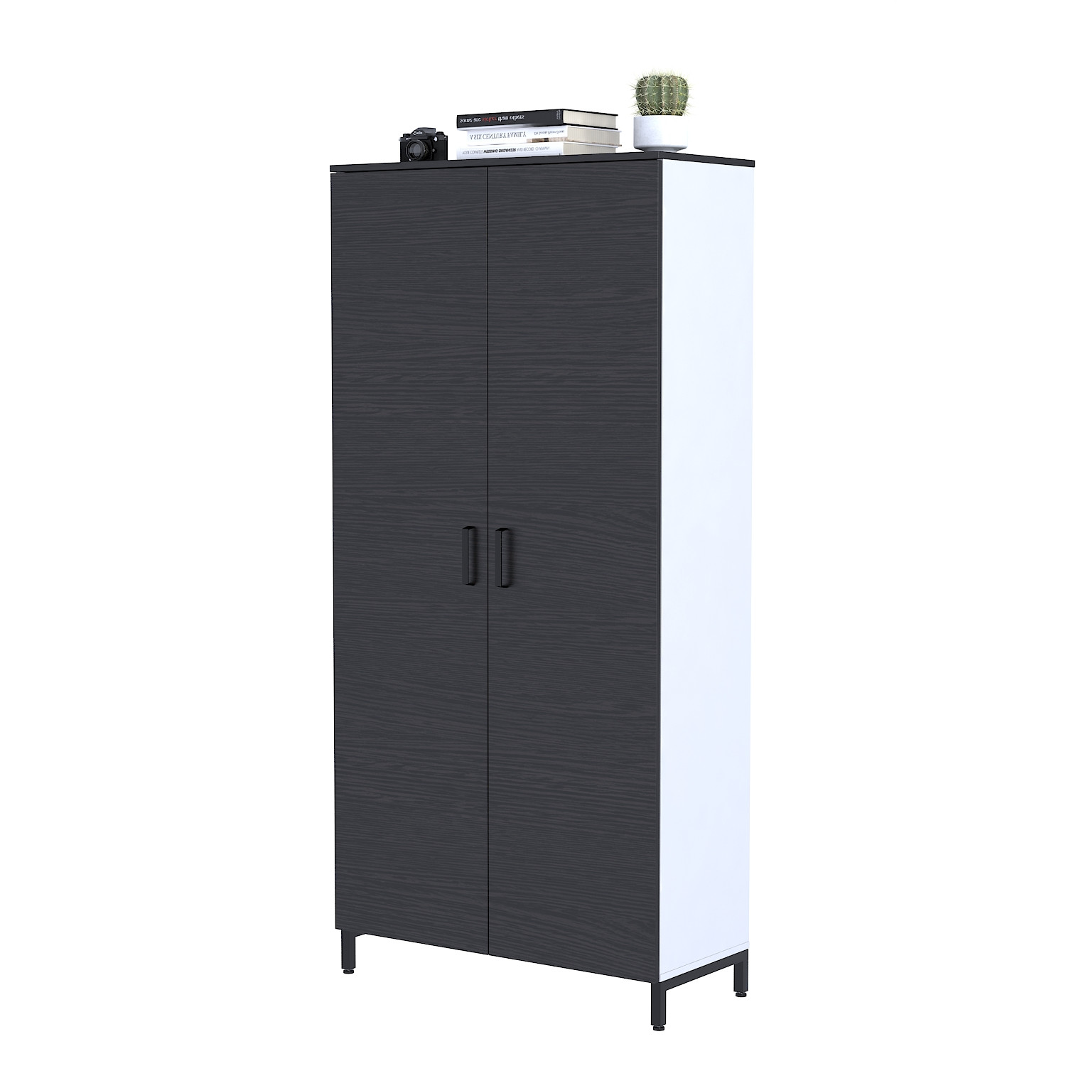 Металеві опори та ручки чорного кольору. Опори комплектуються регульованими ніжками, які дозволяють виставити шафу на нерівній підлозі.