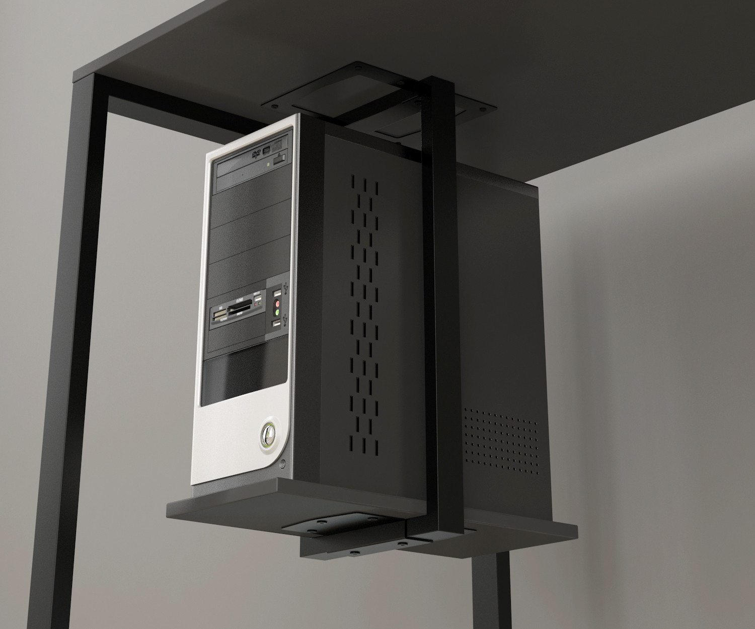Він підійде практично до будь-якого столу, тому що кріпиться безпосередньо до стільниці. Тримач складається з металевих деталей (рамки та кріпильних пластин) та полиці з ДСП.