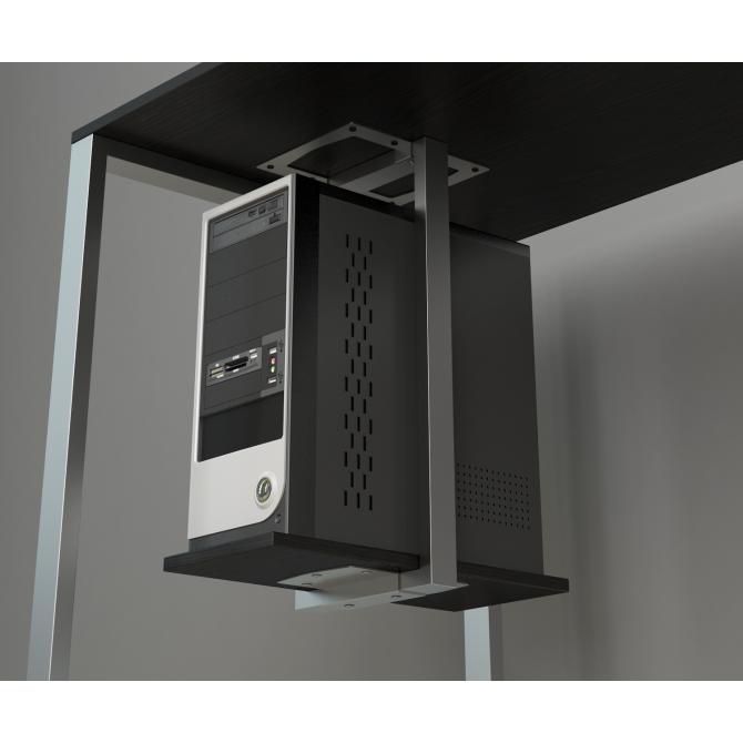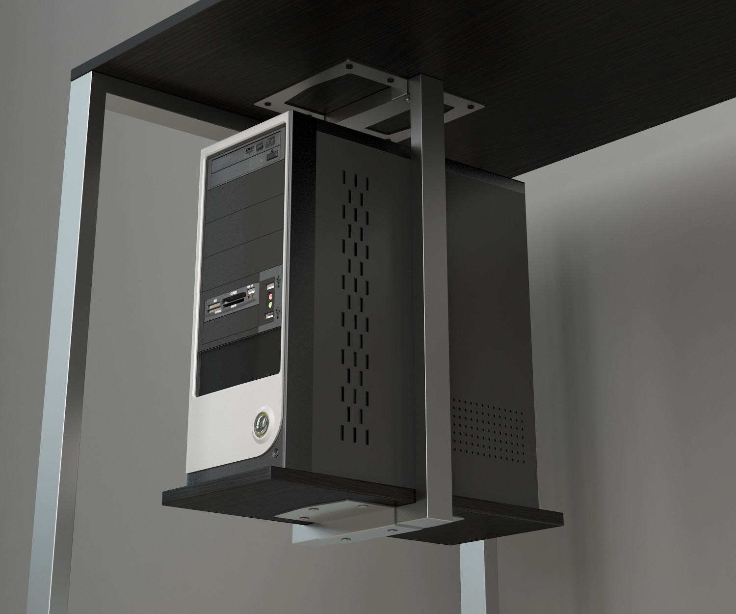 Він підійде практично до будь-якого столу, тому що кріпиться безпосередньо до стільниці. Тримач складається з металевих деталей (рамки та кріпильних пластин) та полиці з ДСП.