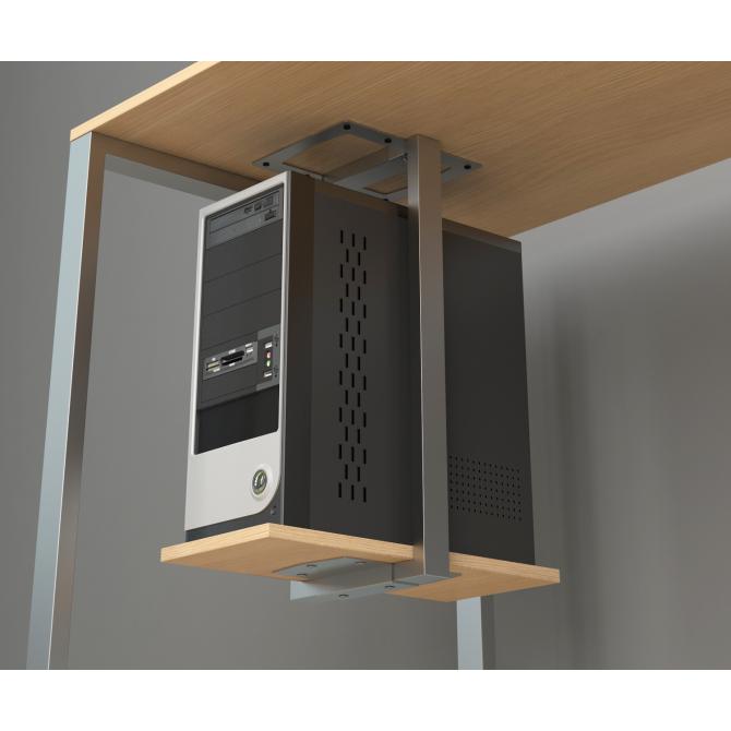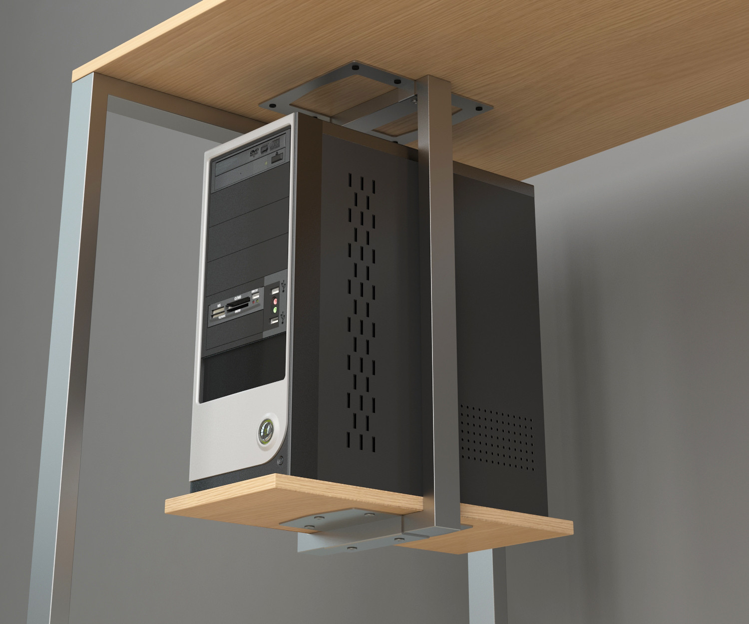 Він підійде практично до будь-якого столу, тому що кріпиться безпосередньо до стільниці. Тримач складається з металевих деталей (рамки та кріпильних пластин) та полиці з ДСП.