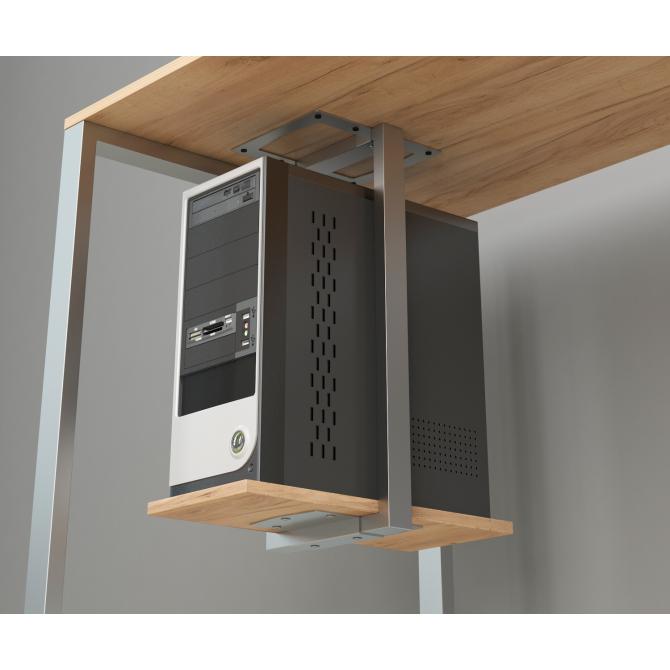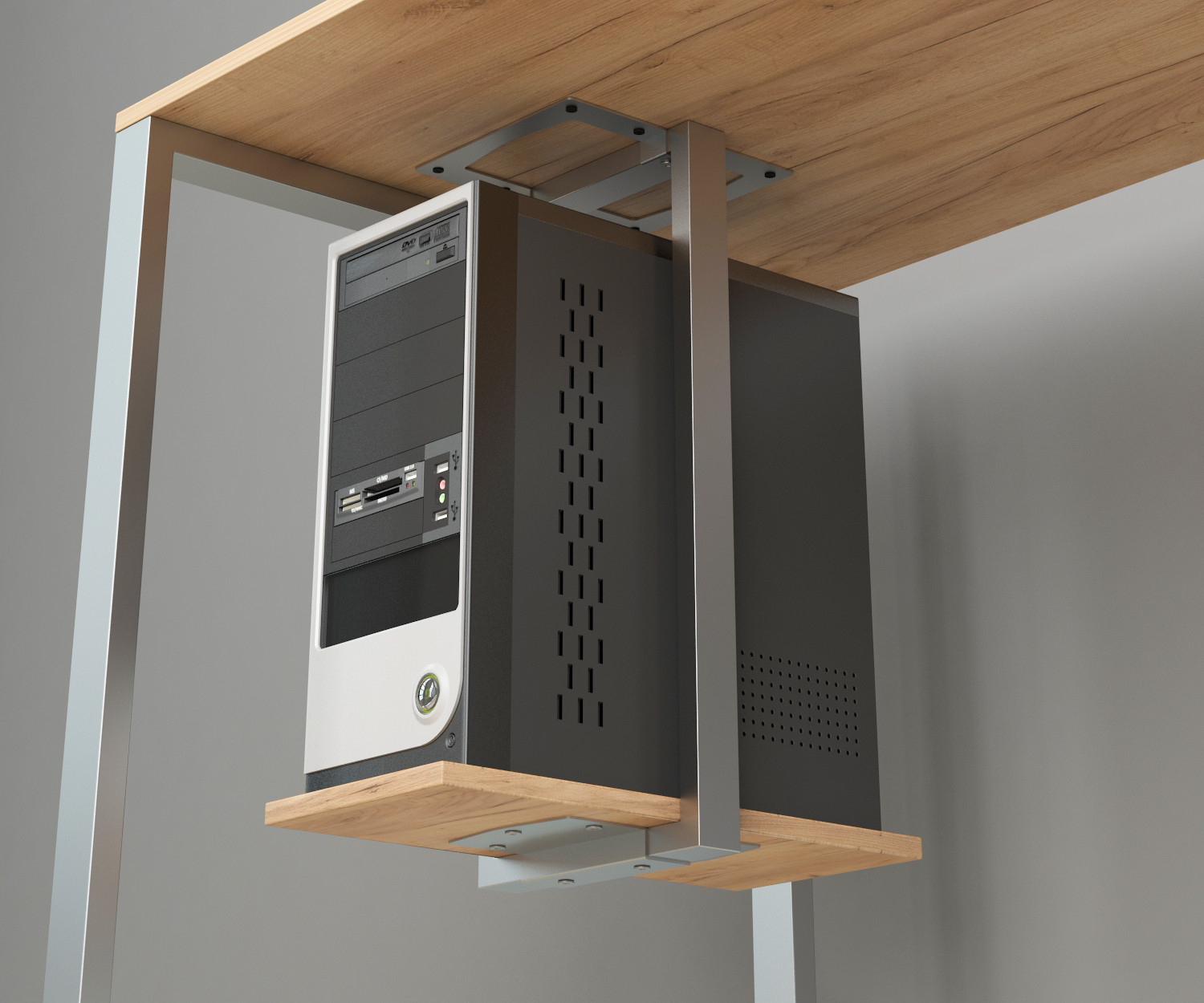 Він підійде практично до будь-якого столу, тому що кріпиться безпосередньо до стільниці. Тримач складається з металевих деталей (рамки та кріпильних пластин) та полиці з ДСП.