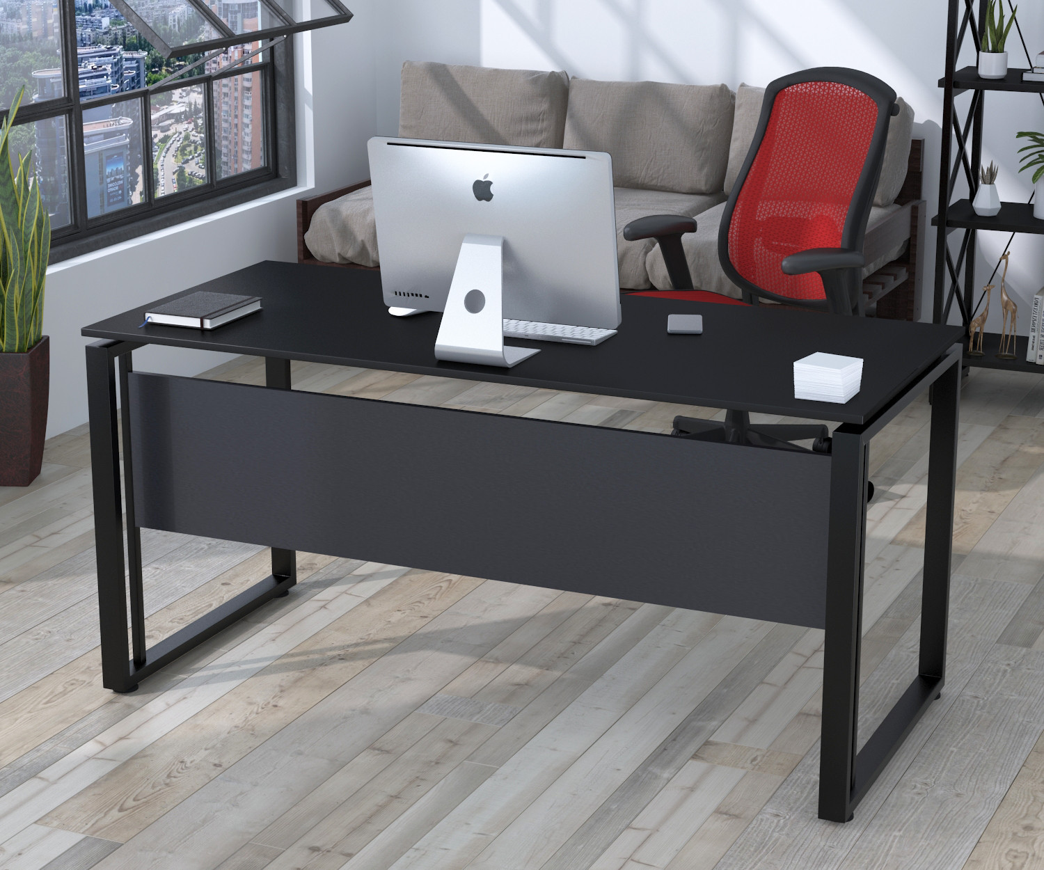 Конструкция стола простая в сборке: две боковины соединены между собой двумя балками, на которые кладется столешница, а царга между боковинами укрепляет каркас, делая его более устойчивым. Регулируемые ножки позволят выставить изделие на неровной поверхности. На выбор покупателя стол может быть оснащен отверстием для компьютерных кабелей или нет. Стол G-160-18 можно приобрести отдельно и в комплекте с другой мебелью коллекции Loft Design.