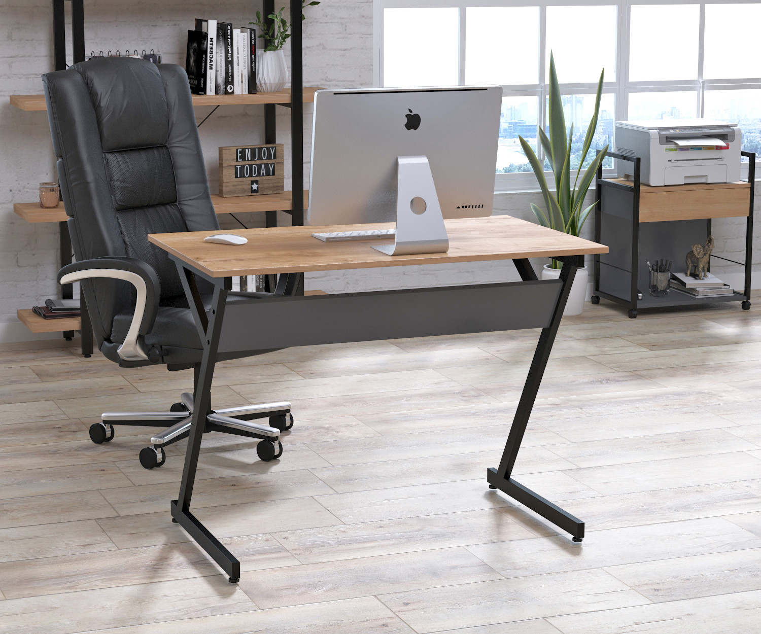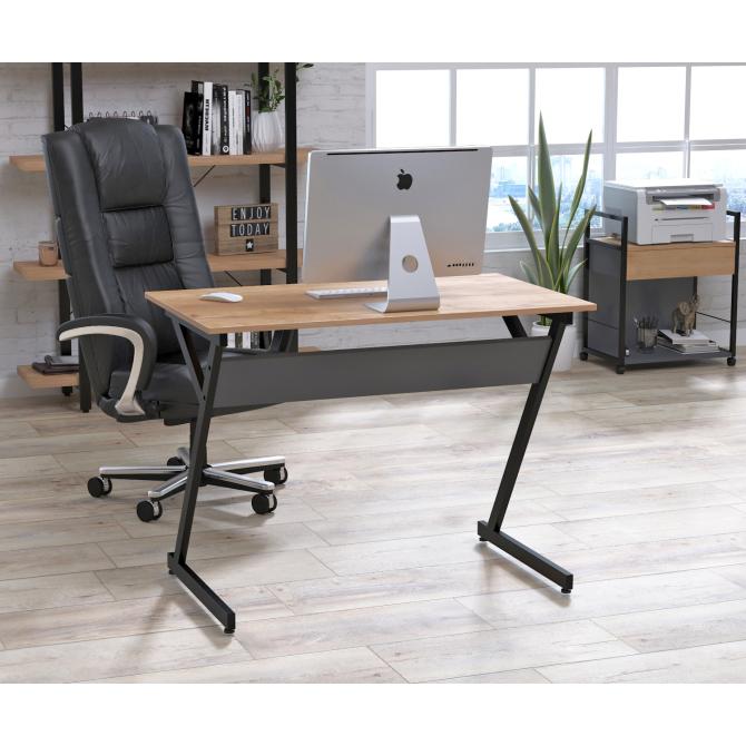 Стіл L-7 має оригінальну конструкцію корпусу, яка ламає наші стереотипи про столи. Замість звичних нам чотирьох опор тут дві Z-подібні ніжки, виконані з металевої труби 40*20 мм. Між ногами встановлена балка жорсткості з ДСП у кольорі антрацит, а під стільницею є металева балка, яка підтримує стільницю.