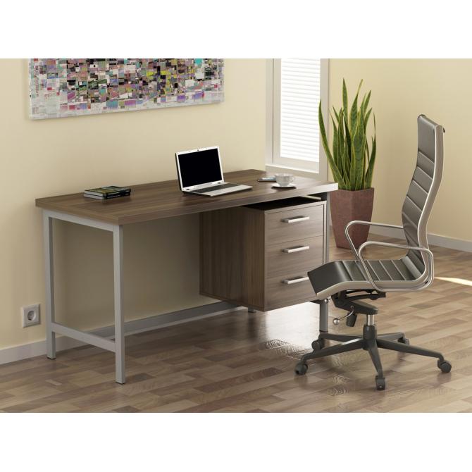 Металева конструкція зроблена із міцного металевого профілю 40*20 мм. Товщина металу 1,4 мм. Конструкція неймовірно міцна і довговічна. Каркас письмового столу L-45 пофарбований сріблястою фарбою під хром. Для більшої стійкості письмового столу, в доповнення до прямокутних ніжок використовується ще три балки стійкості. Дві під стільницею і одна під тумбою. Таким чином, стільниця спирається на ніжки і дві балки, а тумба стоїть на балці і кріпиться вгорі до двох інших балок зверху.