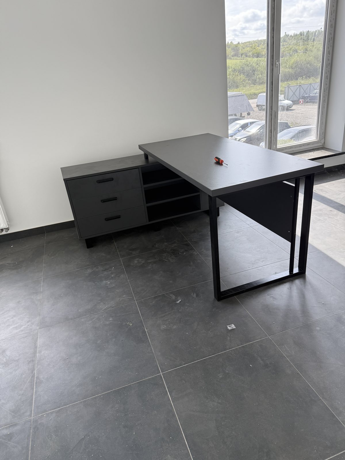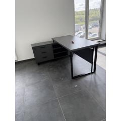 Конструкція складається з металевих опор, основного столу та вбудованої тумби, які виконані з ЛДСП. Опори виготовлені з металевих труб товщиною 50х25 мм. Метал пофарбований у чорний колір, методом порошкового напилення. Завдяки такому покриттю поверхня металу має більш естетичний вигляд і тривалий термін служби. У підставі ніжок встановлені пластикові заглушки. Вони запобігають виникненню потертостей і подряпин на поверхні підлоги. Стільниця виконана зі здвоєного ЛДСП із солідною товщиною в 36 мм.
