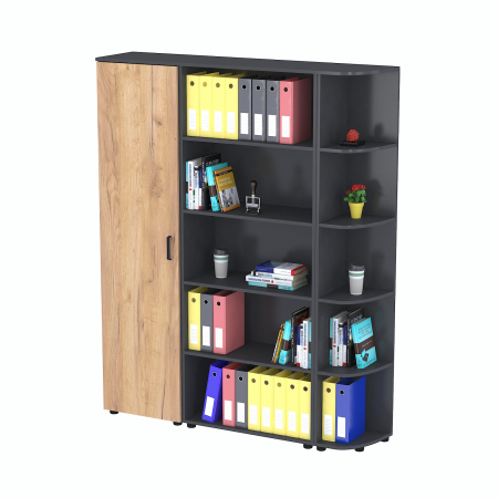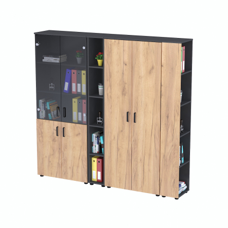 Наші офісні меблі — поєднання простоти, натуральних фактур і металевих елементів. Матеріали — якісне ЛДСП з імітацією деревини та метал (чорний, графітовий або сріблястий), який створює сучасний і діловий вигляд.
