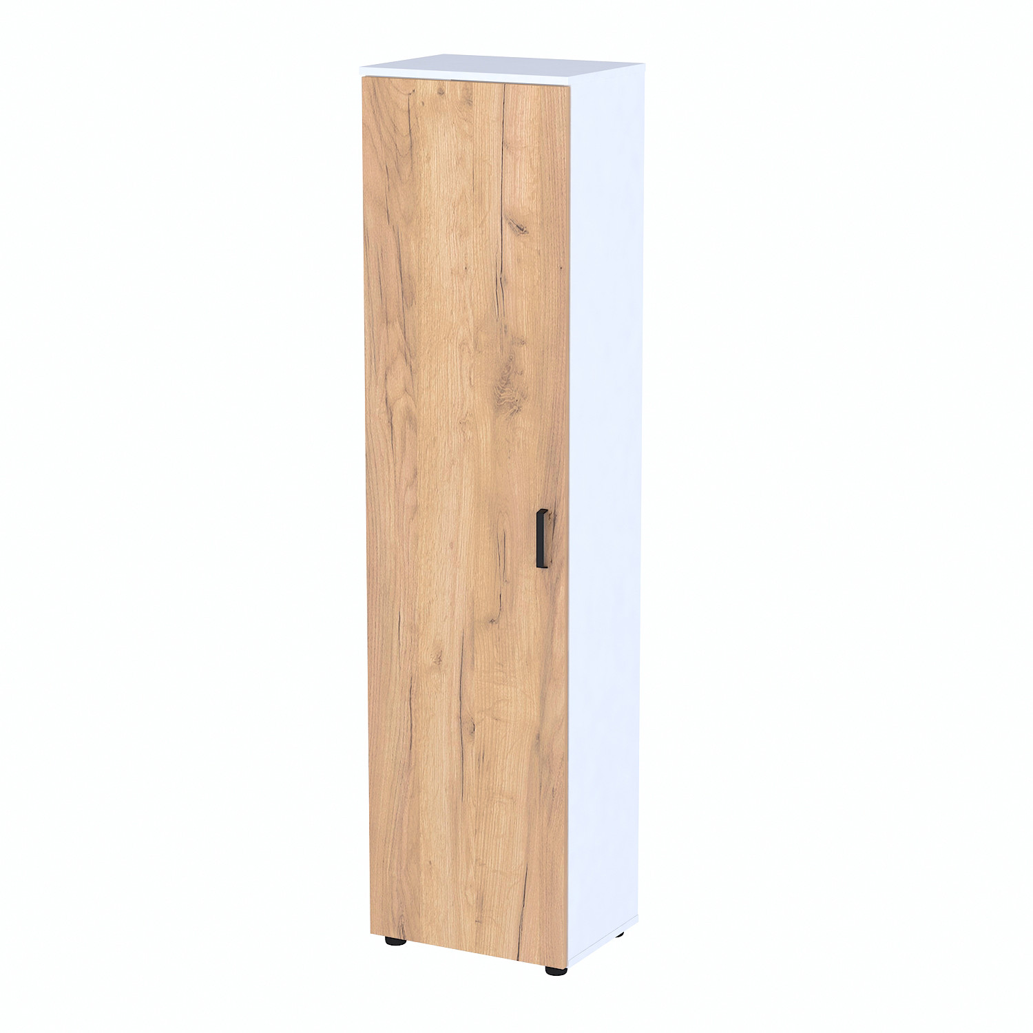 Металева ручка з порошковим покриттям у чорному кольорі підкреслює сучасний вигляд шафи та захищає від подряпин. Регульовані ніжки дають змогу встановити шафу на нерівній поверхні, зберігаючи при цьому цілісність підлоги.