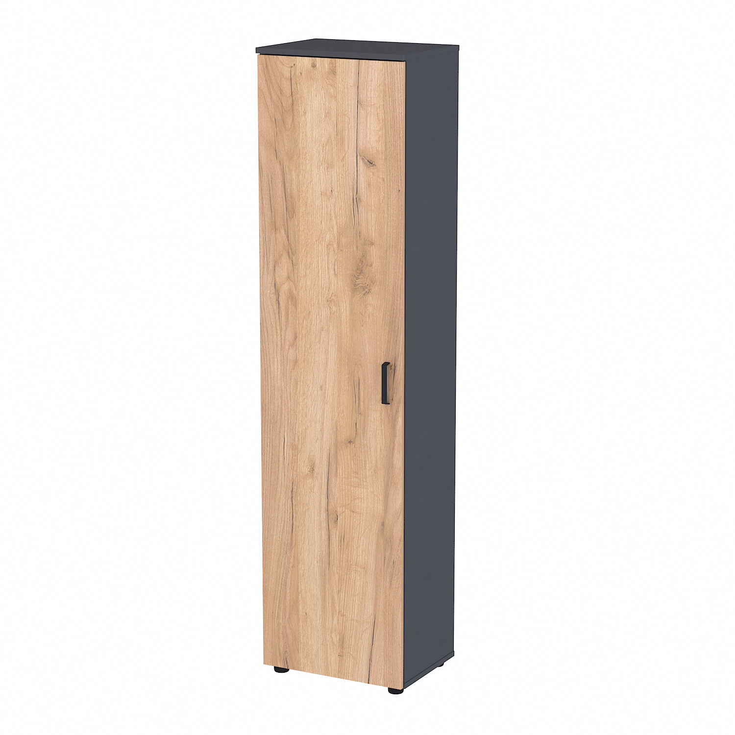 Металева ручка з порошковим покриттям у чорному кольорі підкреслює сучасний вигляд шафи та захищає від подряпин. Регульовані ніжки дають змогу встановити шафу на нерівній поверхні, зберігаючи при цьому цілісність підлоги.
