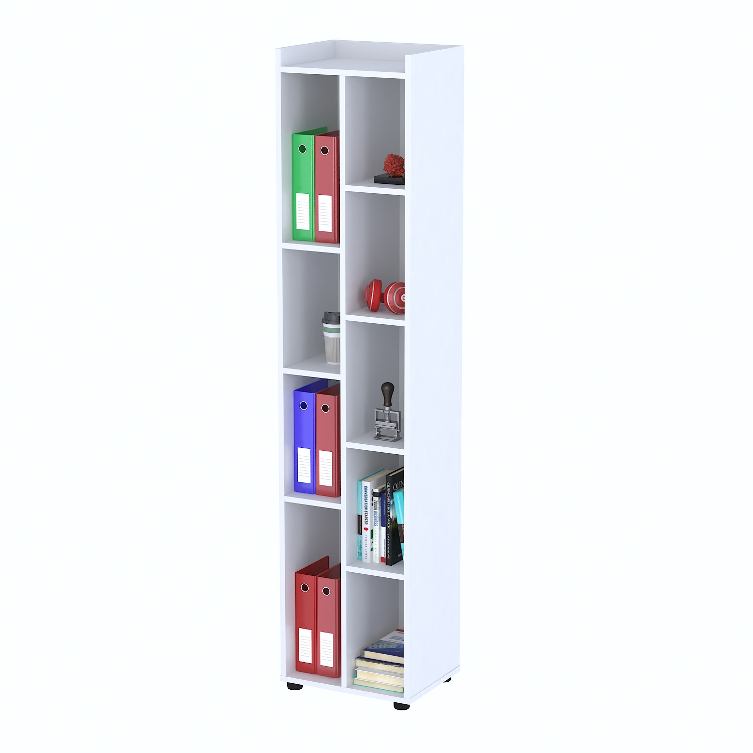 Проміжний стелаж NT5P-45 - практичне рішення для систематизованого зберігання. Дві зони з чотирма і п'ятьма полицями забезпечують зручне розміщення документів, книг і канцелярського приладдя, а дві великі полиці підходять для габаритних речей.