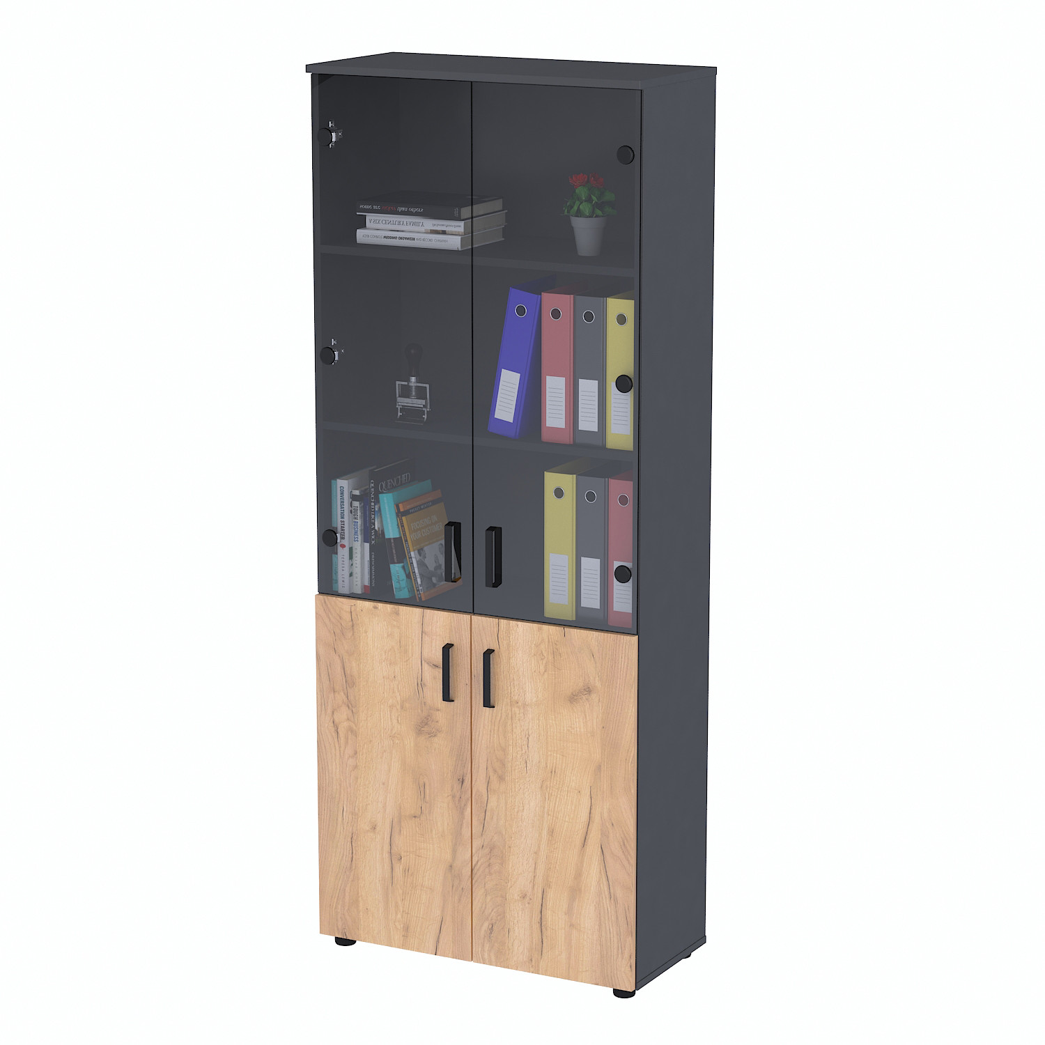 Стелаж NT5-80-2MD-2SK — надійні та елегантні меблі, що допомагають ефективно організувати зберігання документів, книг і офісного приладдя, підтримуючи порядок у робочому просторі.