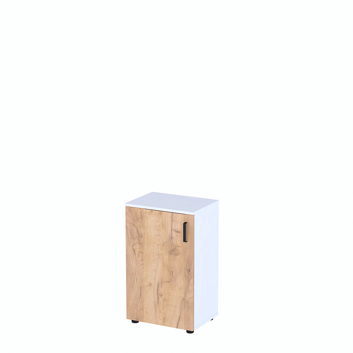 Металева ручка з чорним порошковим покриттям не лише підкреслює сучасний дизайн, а й є стійкою до механічних пошкоджень. Регульовані ніжки забезпечують стійкість шафки на нерівних поверхнях і запобігають пошкодженню підлогового покриття.