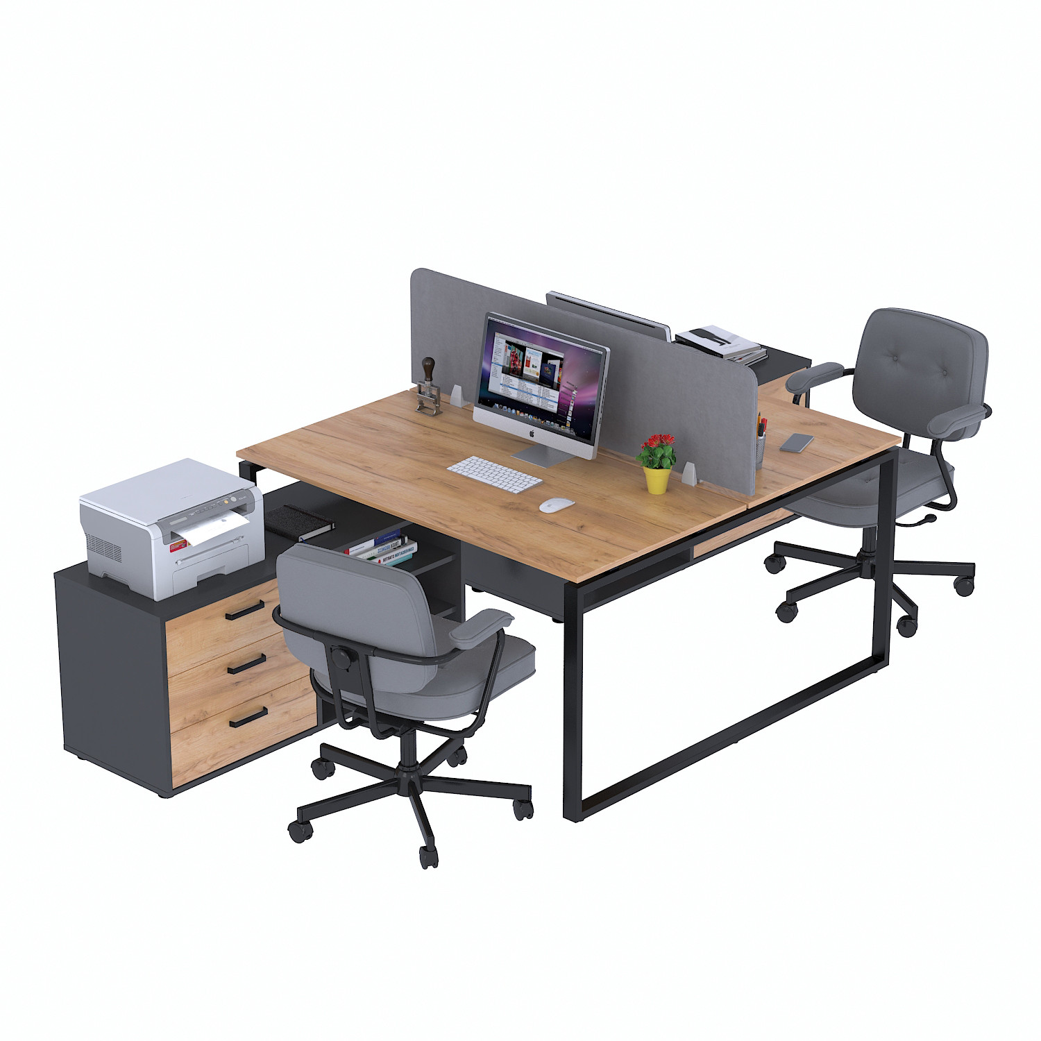• Практична вбудована подвійна тумба. Двосекційна конструкція включає висувні шухляди та відкриті полиці, що забезпечують зручну організацію робочого простору і спрощують зберігання необхідних речей.