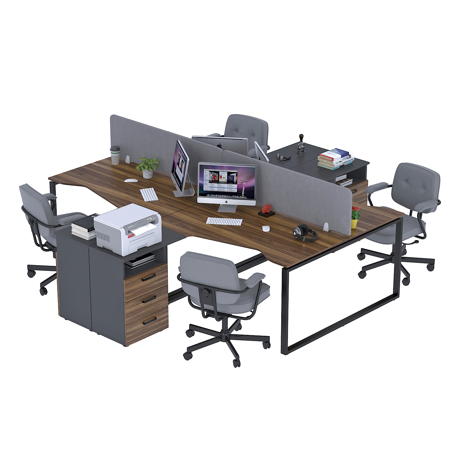 - Просторі робочі зони: чотири стільниці з ДСП преміум-класу товщиною 18 мм забезпечують достатньо простору для комфортної роботи чотирьох співробітників.