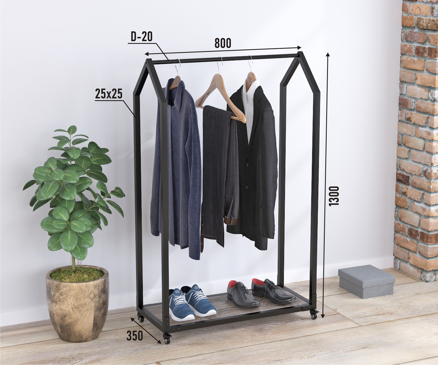 Мобільна конструкція. Надійні коліщатка дозволяють легко переміщати вішалку по всій кімнаті, встановлюючи її в потрібному місці. Стане чудовим вибором для фотостудій, шоурумів, модельних агентств, виробництв або магазинів одягу.