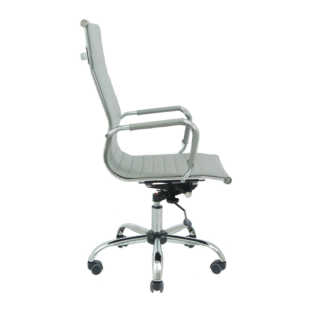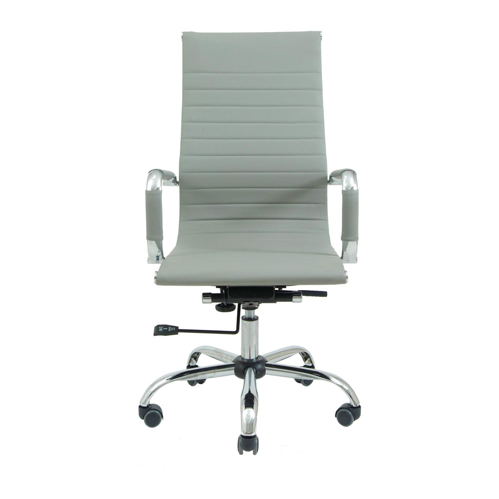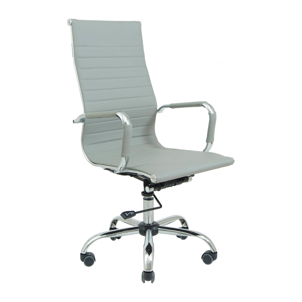 Поверхня спинки декорована горизонтальною прошивкою, що надає стильного вигляду офісному кріслу. Оббивка з високоякісної екошкіри сірого кольору дозволяє максимально комфортно розташовуватися в кріслі, не втомлюючись від тривалого перебування в ньому.