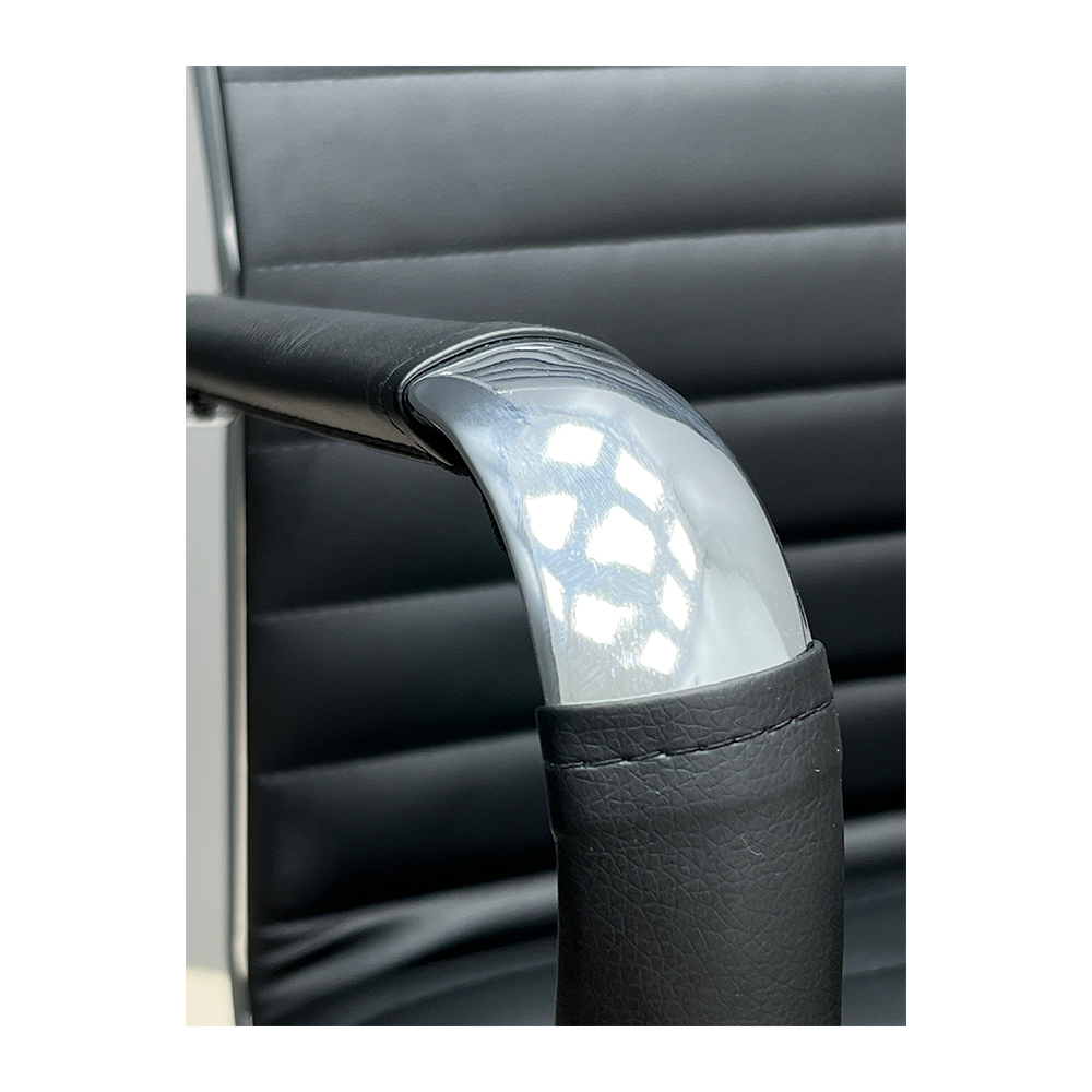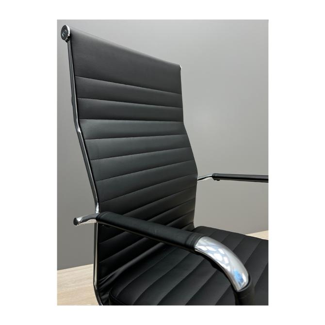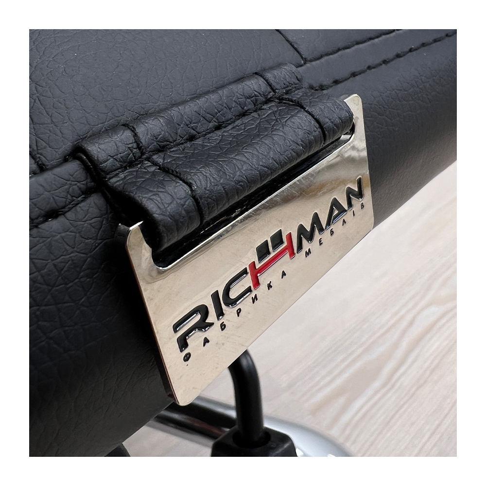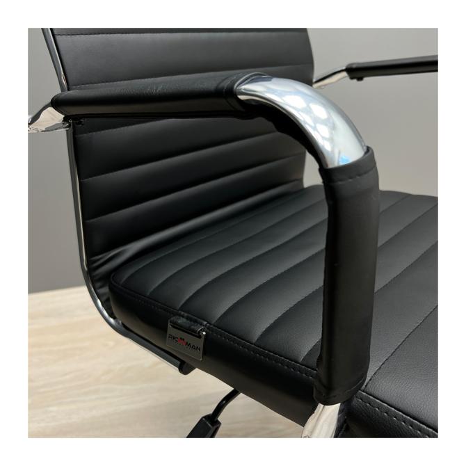 Крісло оббите якісною екошкірою чорного кольору. Хромовані підлокітники із чохлами дозволяють зручно спертися на них у будь-якому положенні та розмістити руки під час відпочинку.