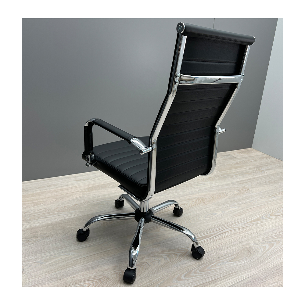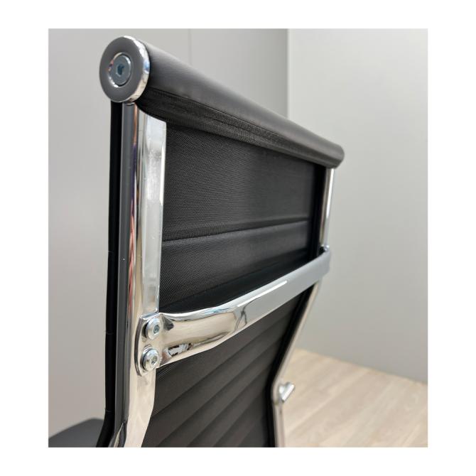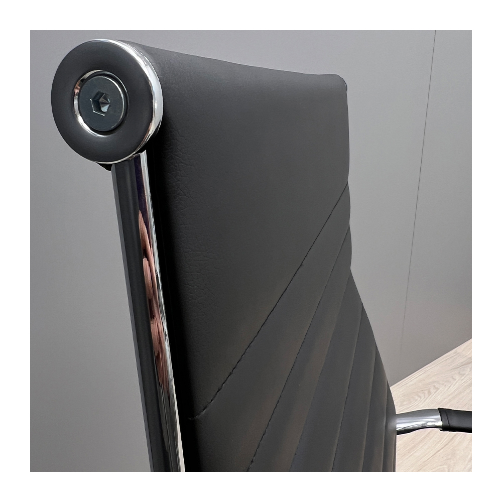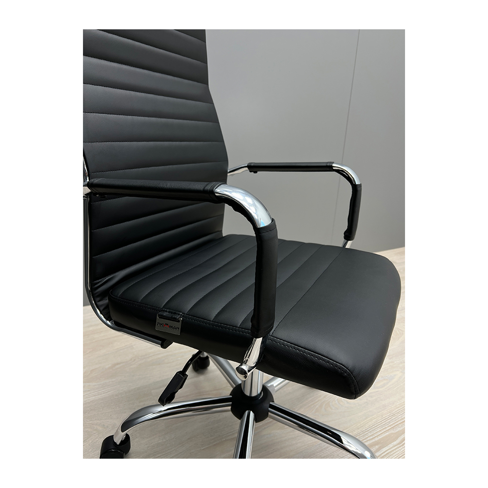 Крісло оббите якісною екошкірою чорного кольору. Хромовані підлокітники із чохлами дозволяють зручно спертися на них у будь-якому положенні та розмістити руки під час відпочинку.