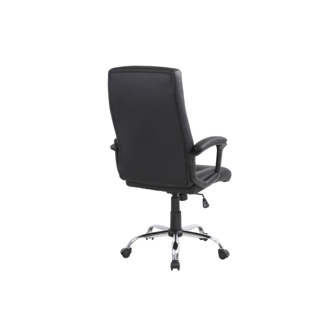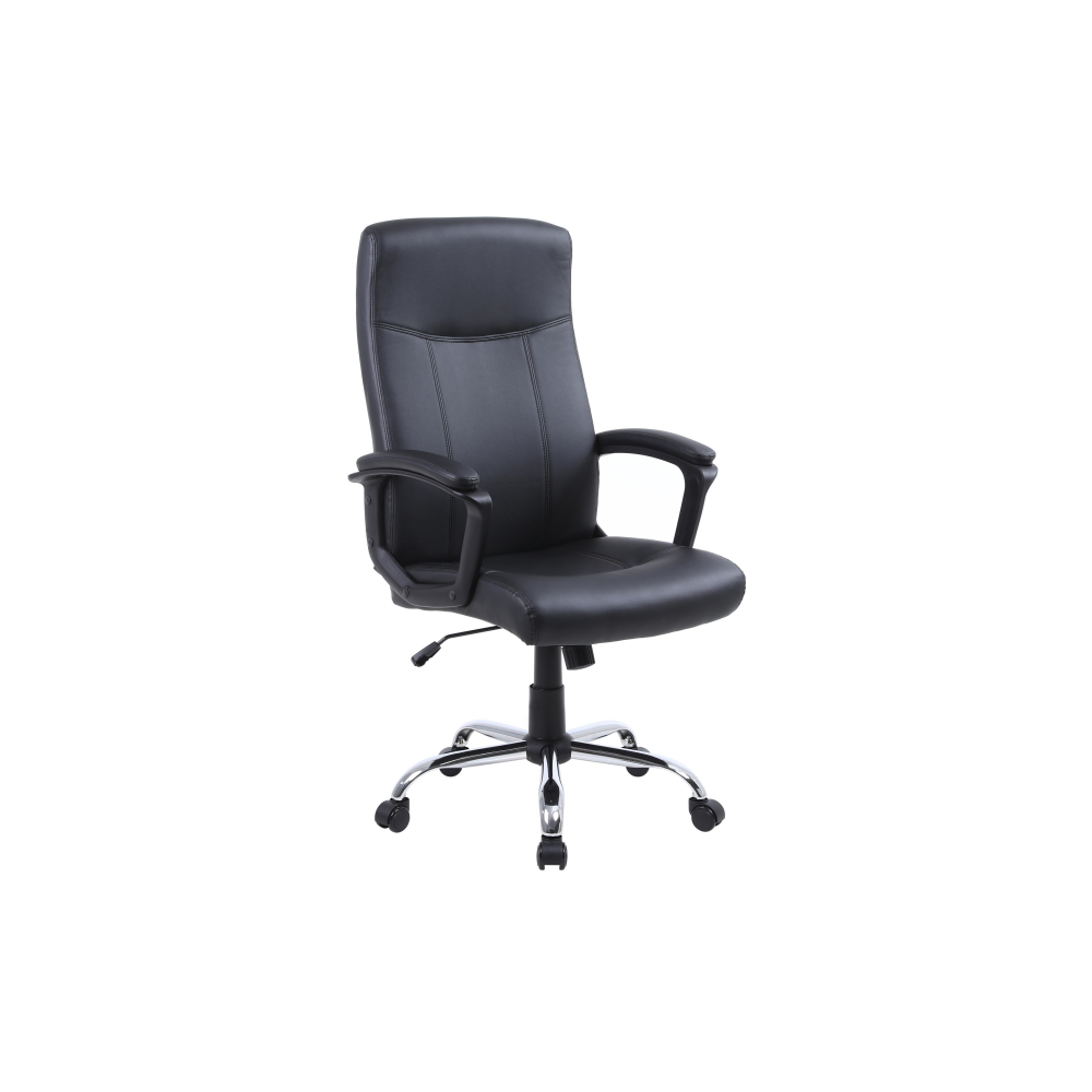 Оббивка крісла виготовлена з якісного чорного шкірозамінника, що не лише забезпечує довговічність та простоту у догляді, але й надає естетично привабливий зовнішній вигляд. Пластикові підлокітники, посилені металевими закладними, доповнені м’якими накладками для забезпечення комфорту під час тривалого використання.