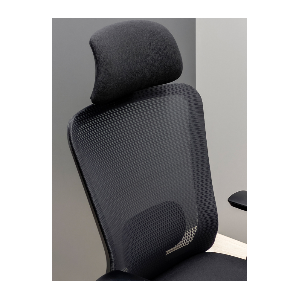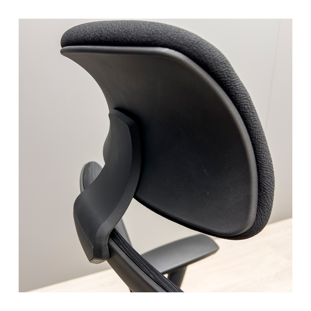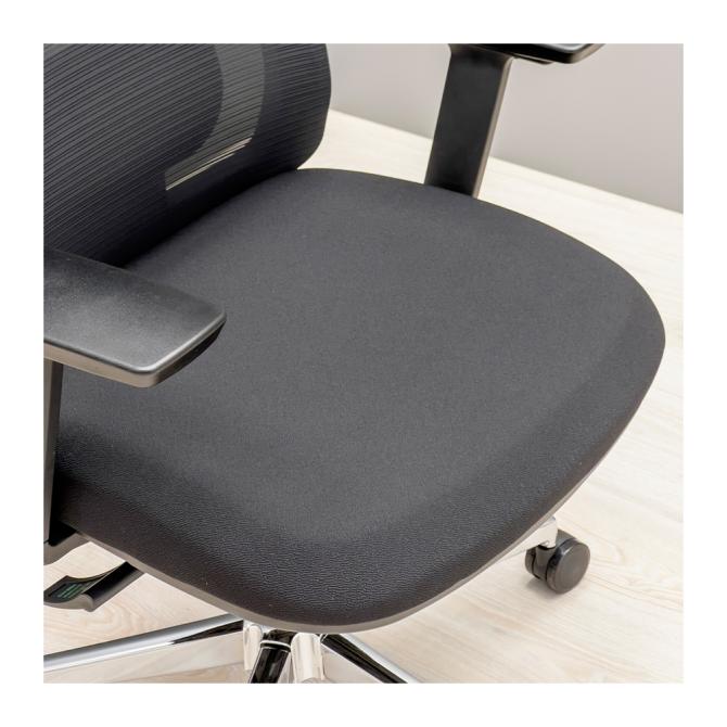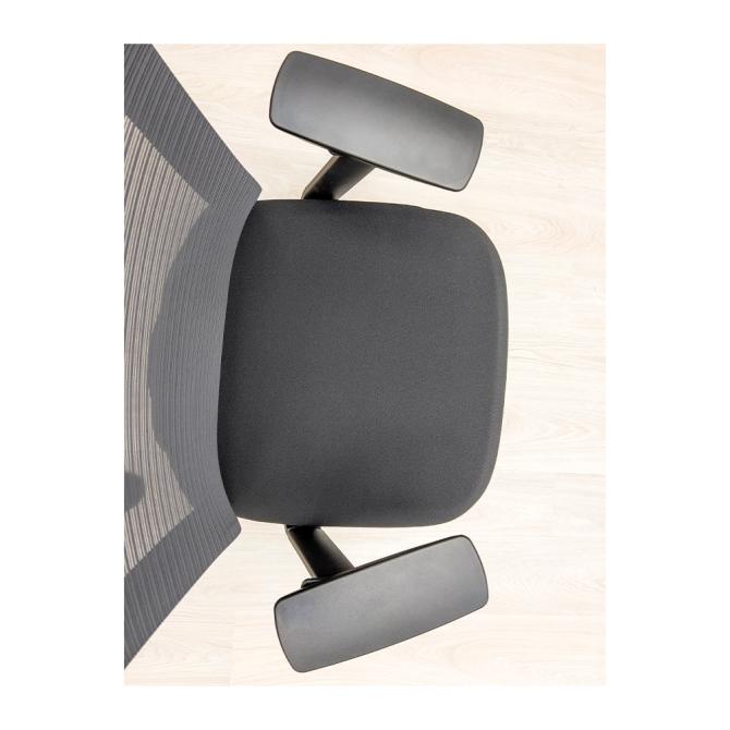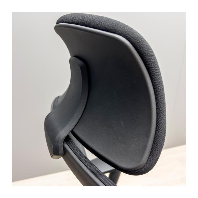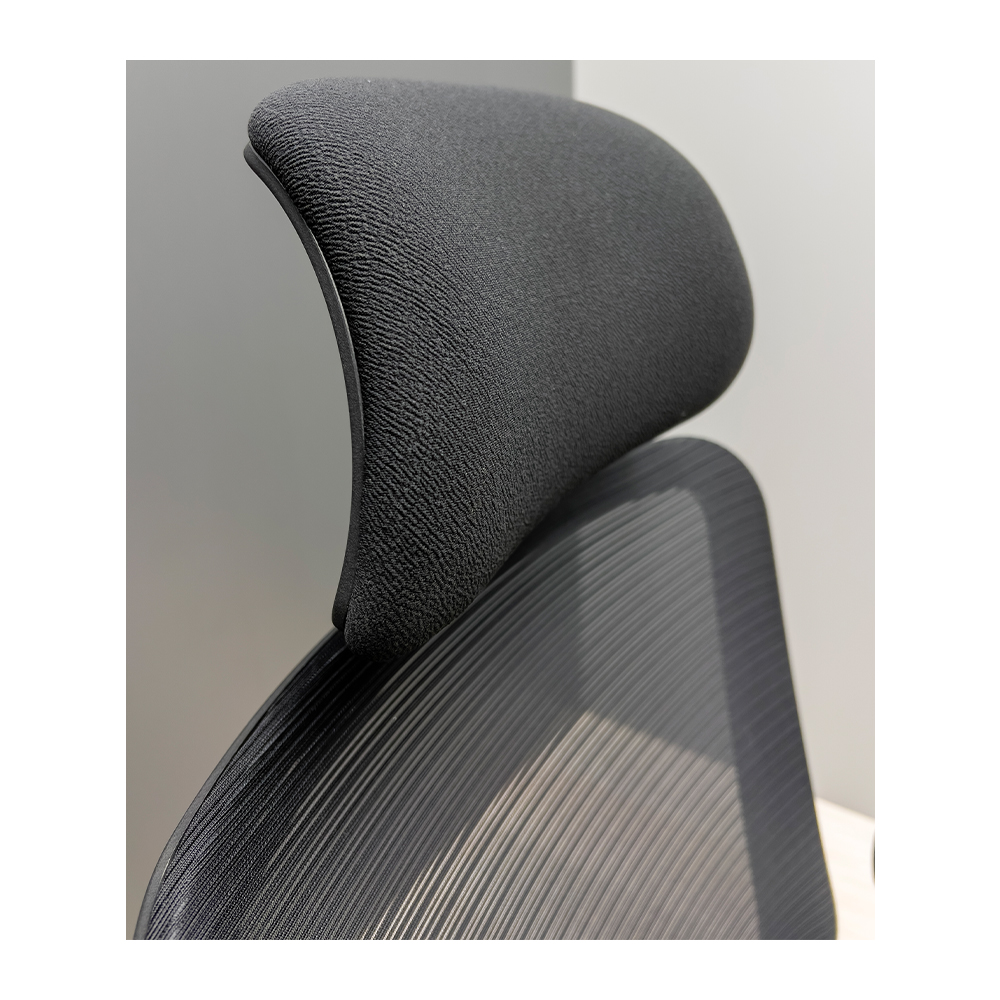 Підголівник крісла, м’який та регульований за висотою, оббитий приємною на дотик тканиною, забезпечує підтримку та комфорт під час тривалого сидіння. Спинка, виконана з дихаючої сітчастої тканини, оснащена регульованим м’яким поперековим підпором, що забезпечує додаткову підтримку та попереджає втому. Сидіння оббите тканиною, гарантує комфорт та зручність протягом усього дня.