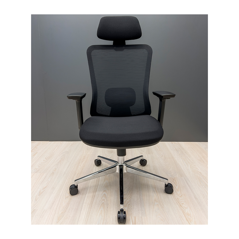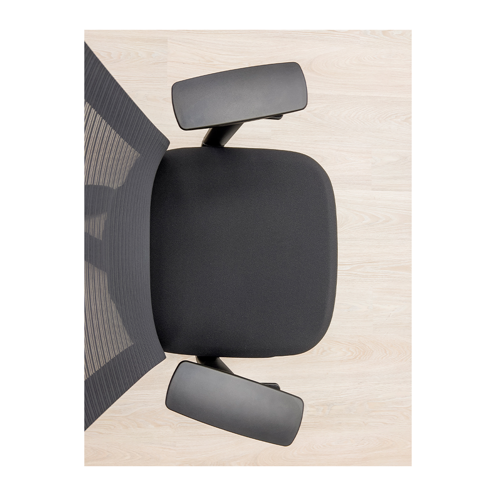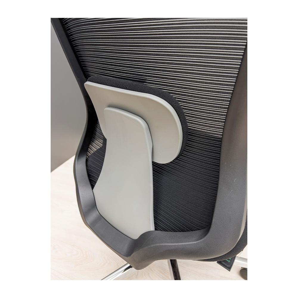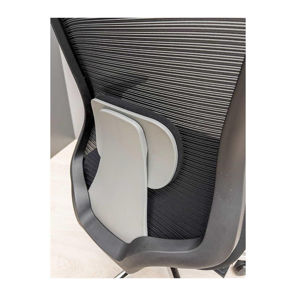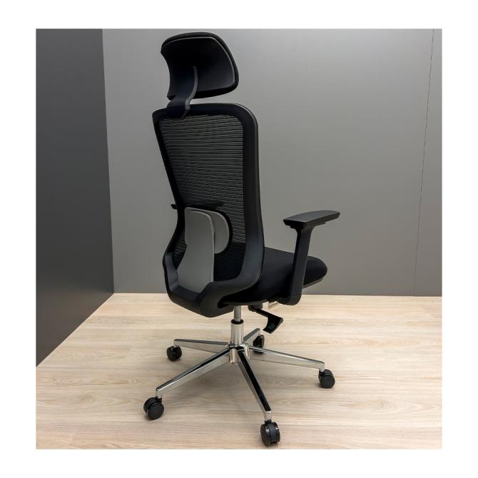 Підголівник крісла, м’який та регульований за висотою, оббитий приємною на дотик тканиною, забезпечує підтримку та комфорт під час тривалого сидіння. Спинка, виконана з дихаючої сітчастої тканини, оснащена регульованим м’яким поперековим підпором, що забезпечує додаткову підтримку та попереджає втому. Сидіння оббите тканиною, гарантує комфорт та зручність протягом усього дня.