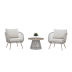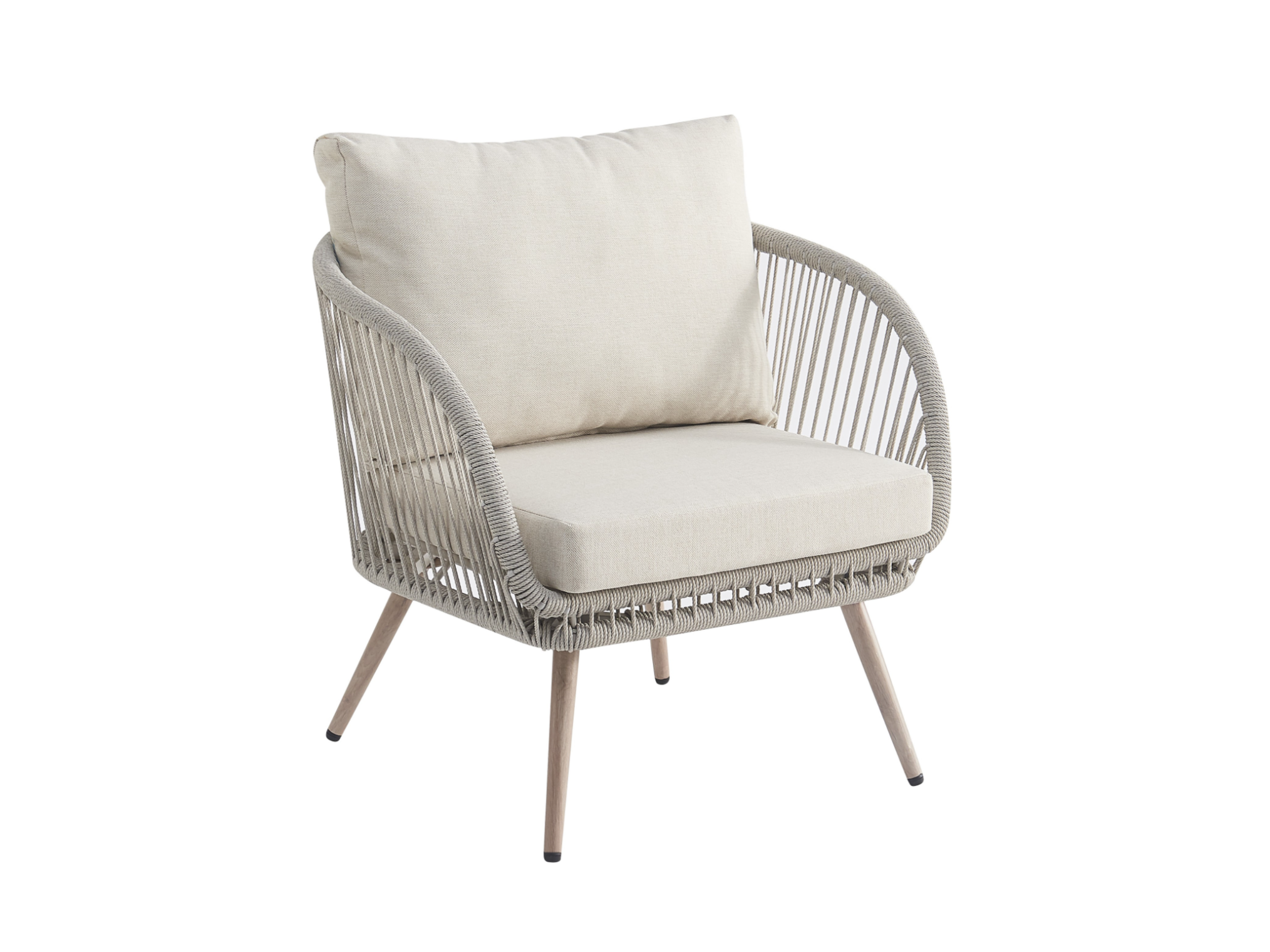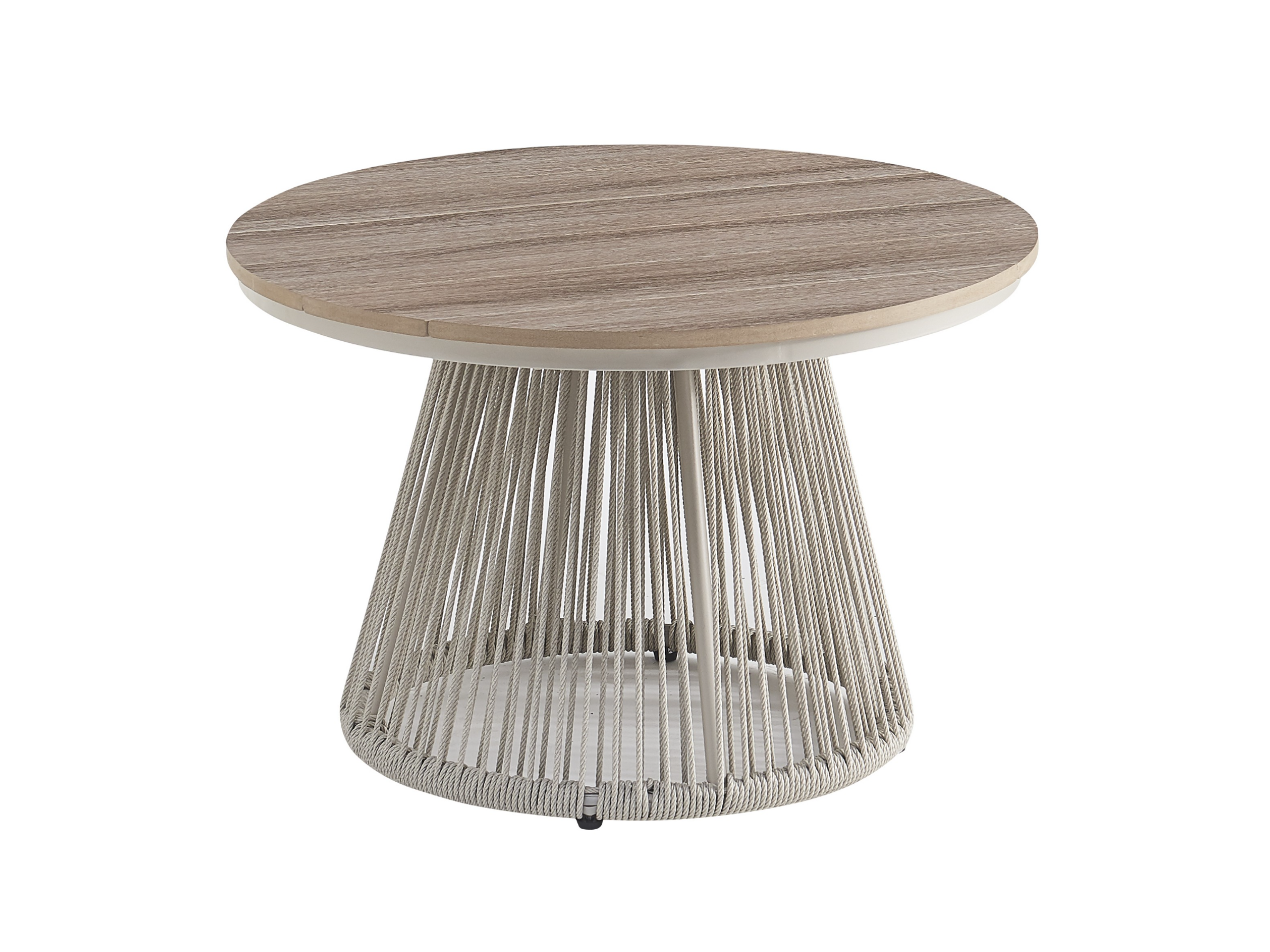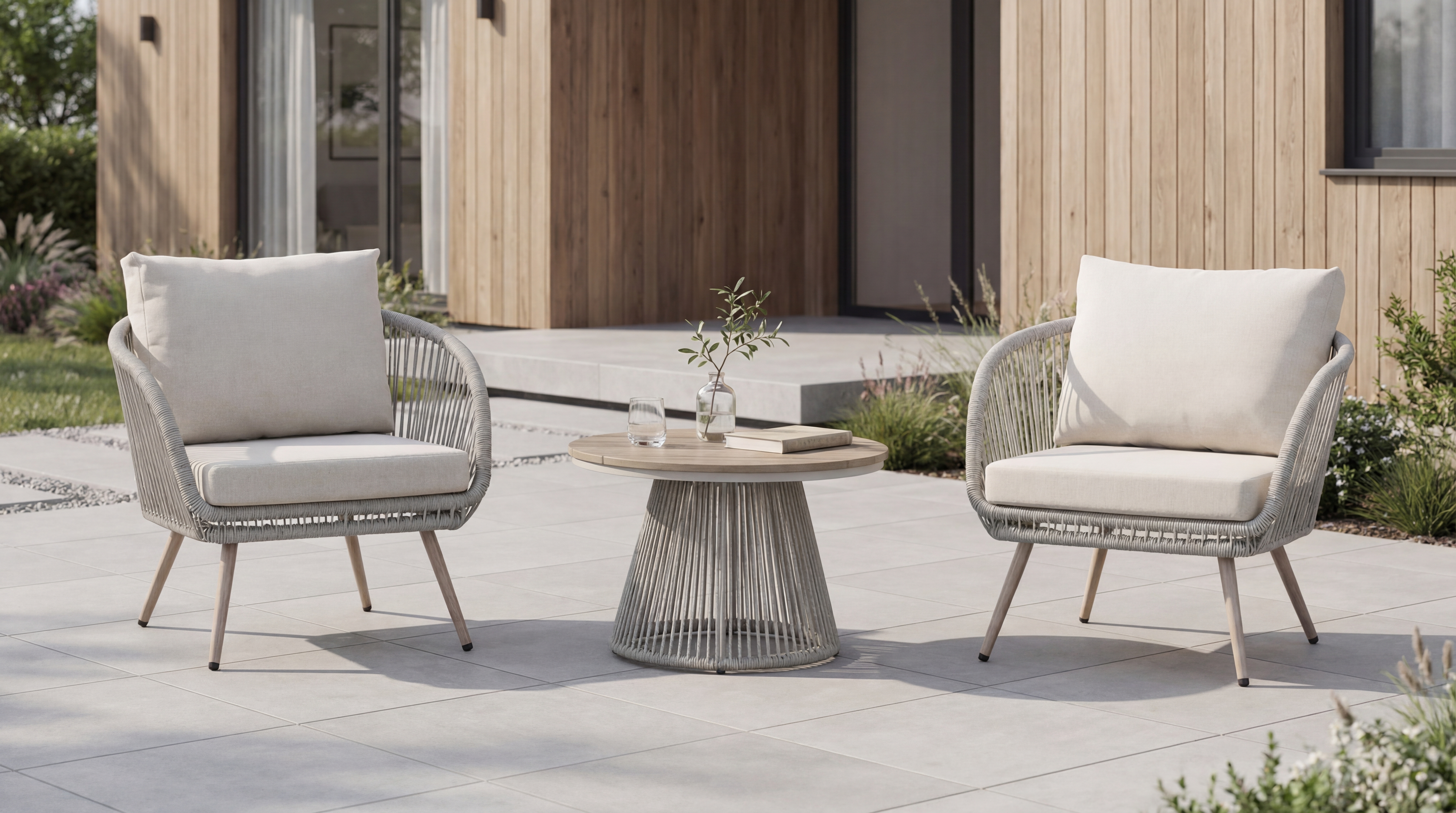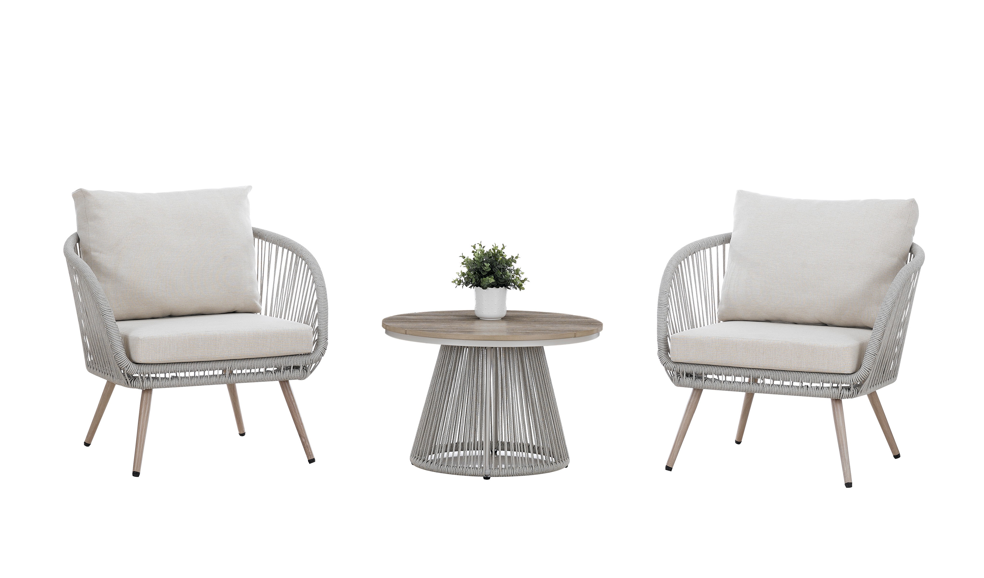 Стільниця виготовлена з деревополімерного композиту — практичного матеріалу, який поєднує зовнішній вигляд натурального дерева зі стійкістю до вологи, ультрафіолету та температурних змін. Основа столика та каркаси крісел виконані з фарбованої оцинкованої сталі у поєднанні зі штучним ротангом, що забезпечує високу міцність, довговічність і стійкість до впливу зовнішнього середовища. Ніжки мають декоративне покриття під дерево, яке підкреслює натуральну стилістику комплекту.