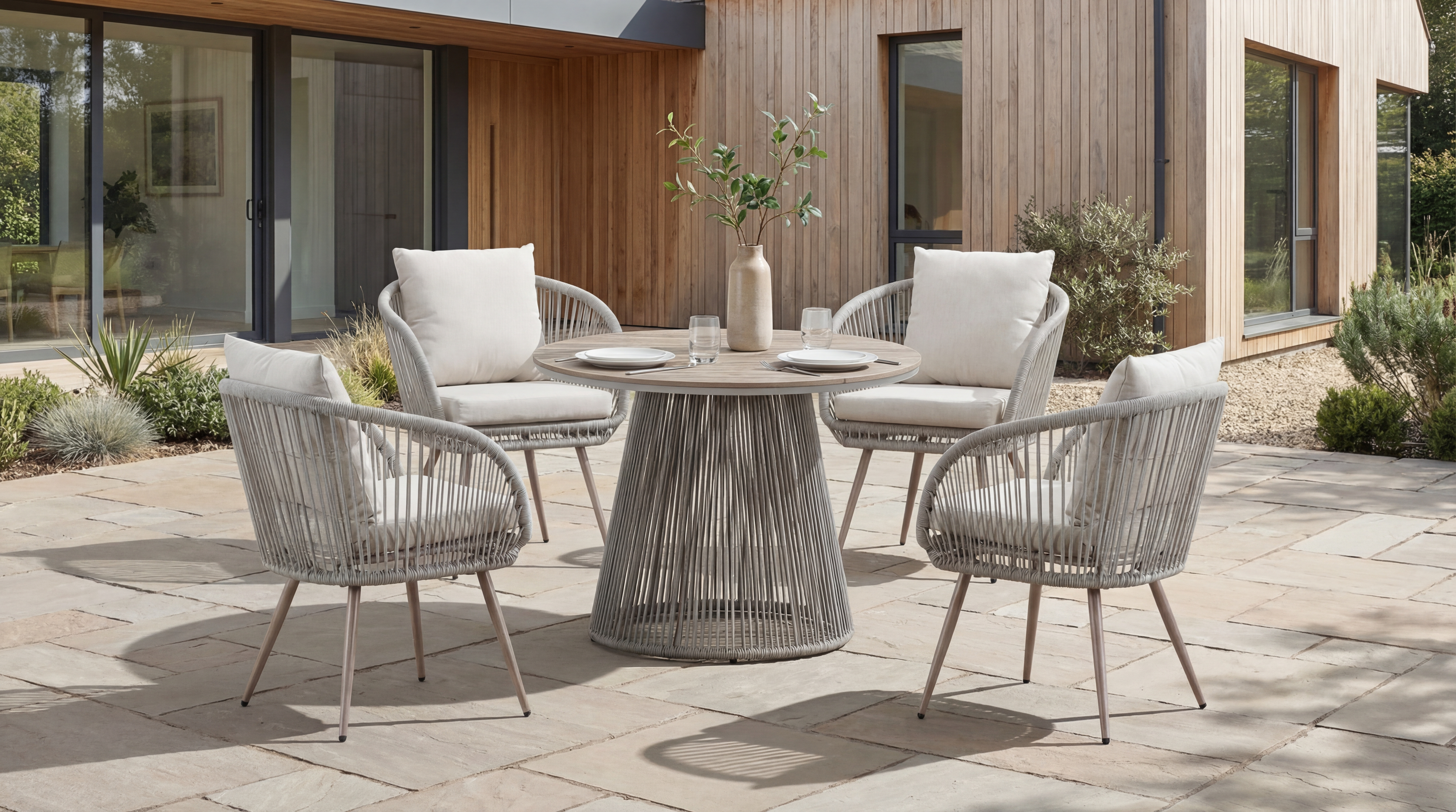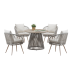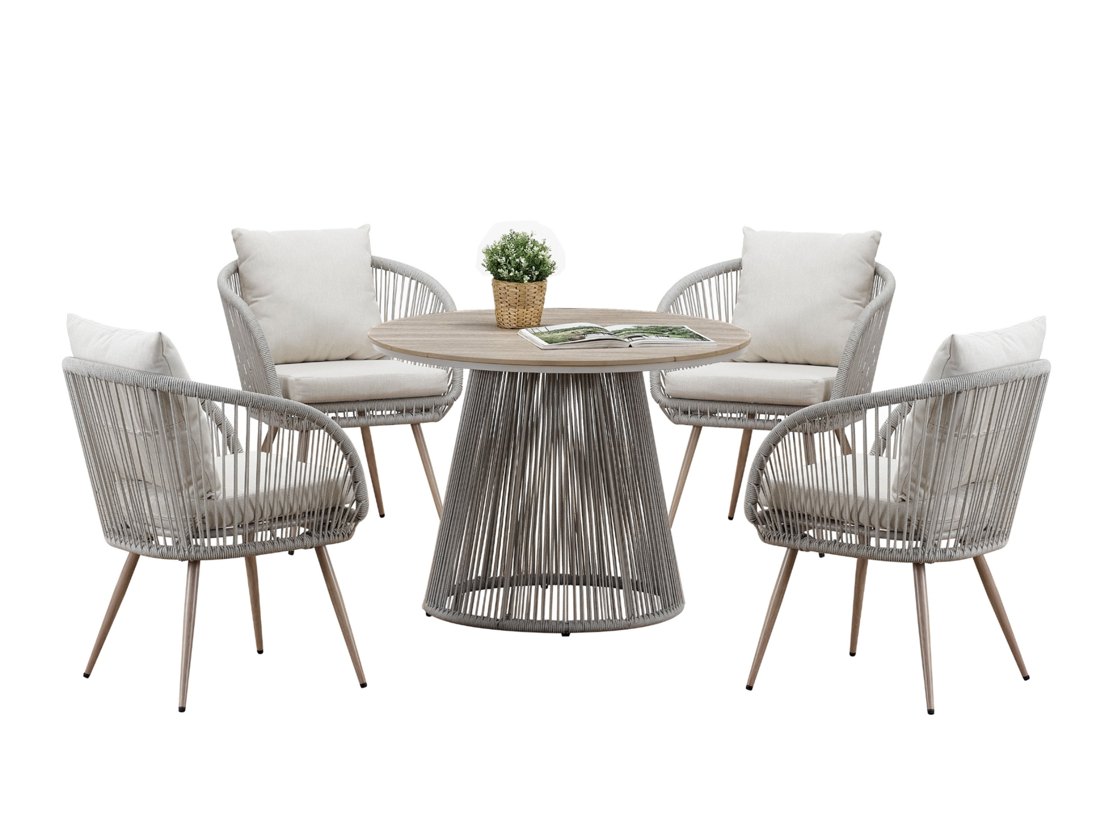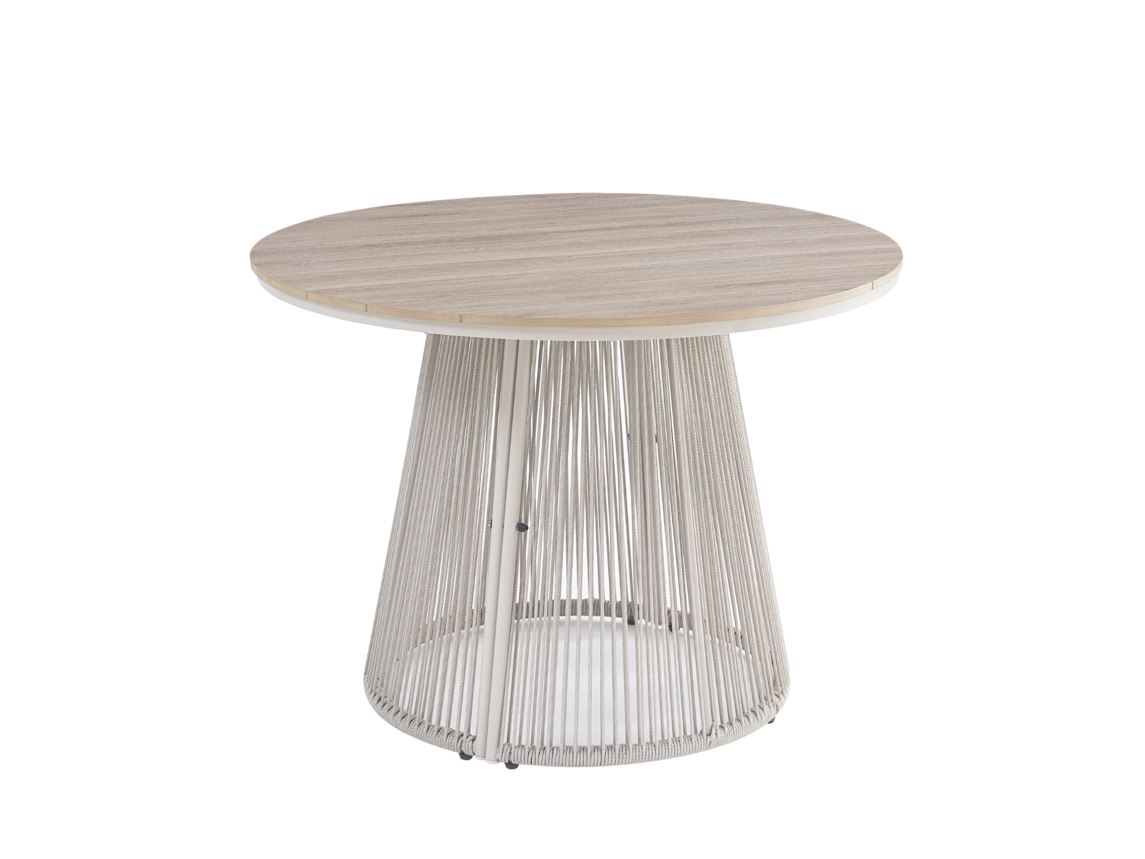 Основа столу виконана з фарбованої оцинкованої сталі у поєднанні зі штучним ротангом, що забезпечує надійність конструкції, довговічність та стійкість до зовнішніх впливів. Така комбінація матеріалів додає столу візуальної легкості та підкреслює його природний стиль.